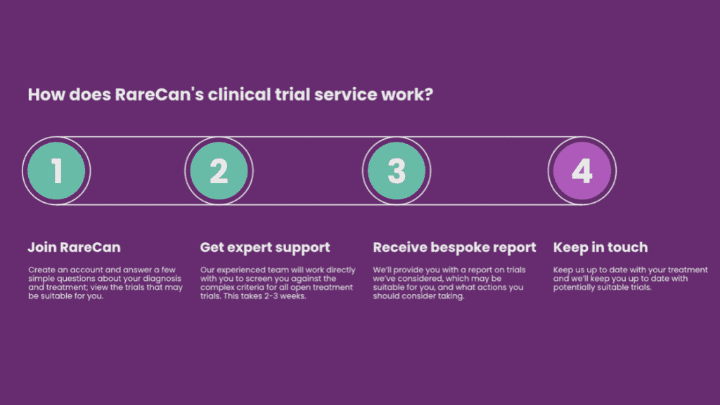 We know how hard it can be to find clinical trials, work out whether or not any particular trial might be suitable for you, and then get in contact with the appropriate trial site. RareCan offers a free service, supporting you through this process.